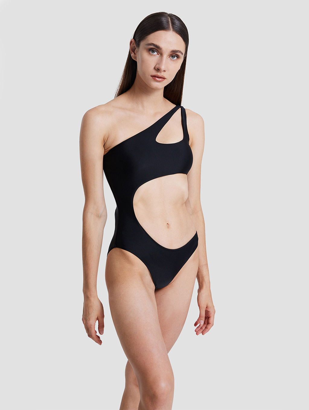 A solid color hollow one-piece swimsuit, diagonal shoulder straps, mostly exposed with less burden.