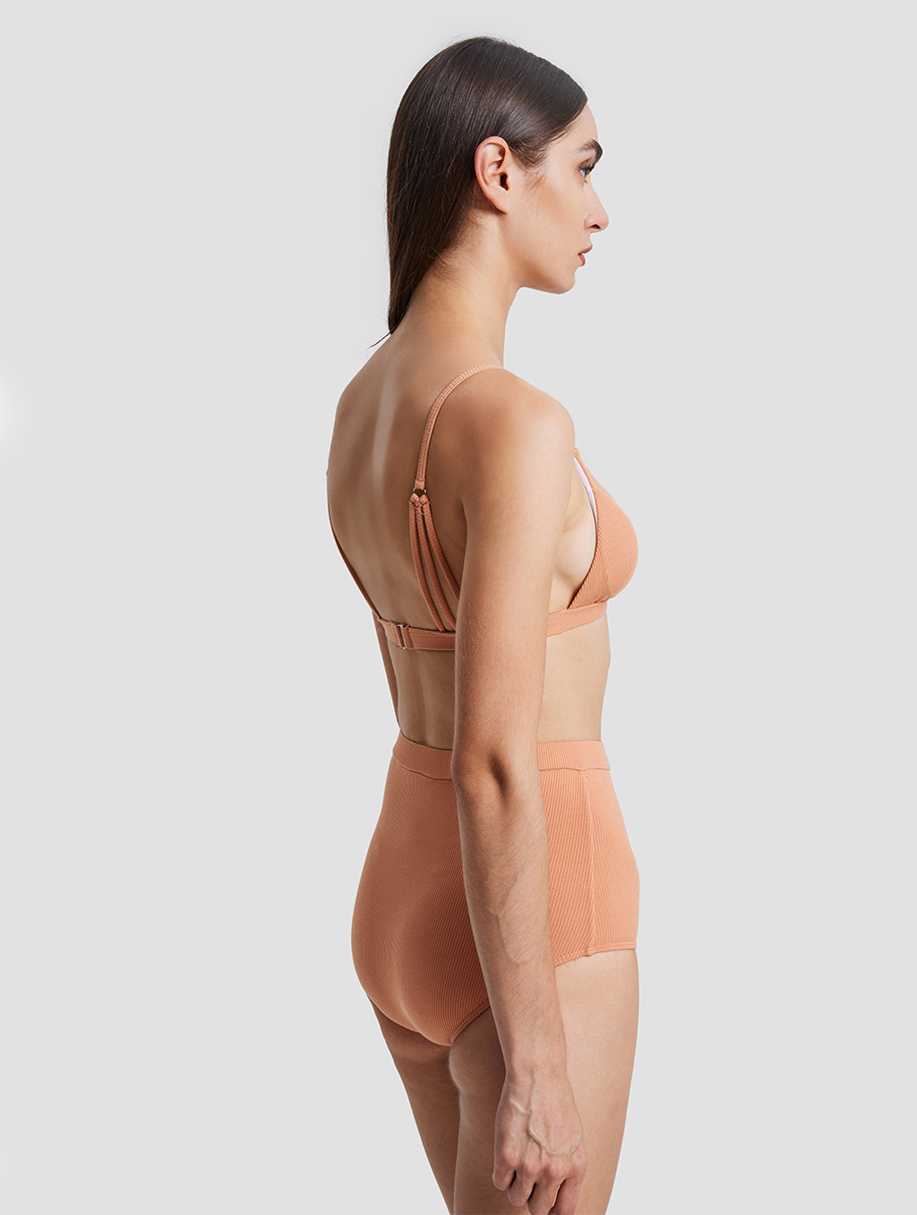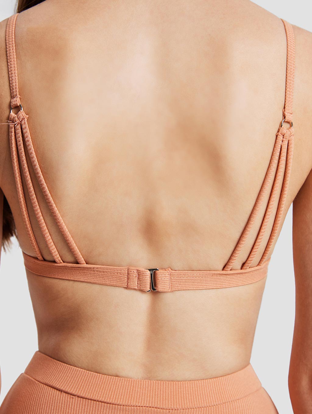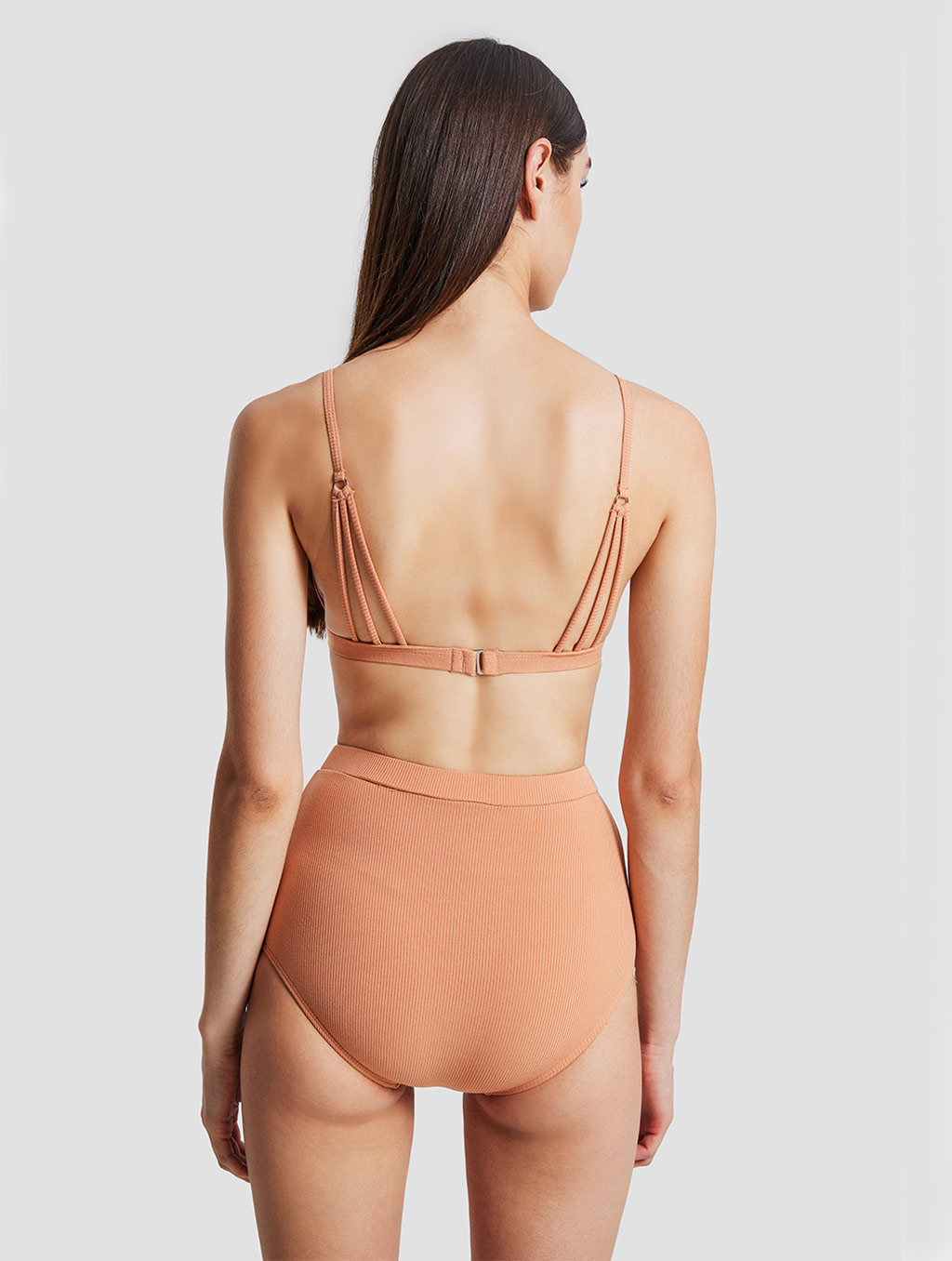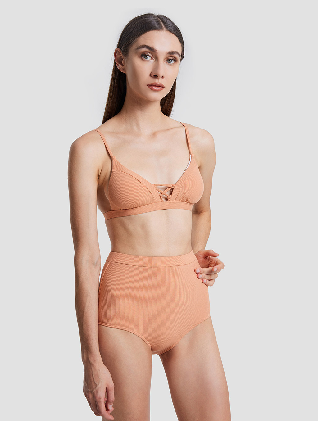 A solid color bikini suit, thin shoulder straps, back buckle design, high waist shorts, comfortable and beautiful.