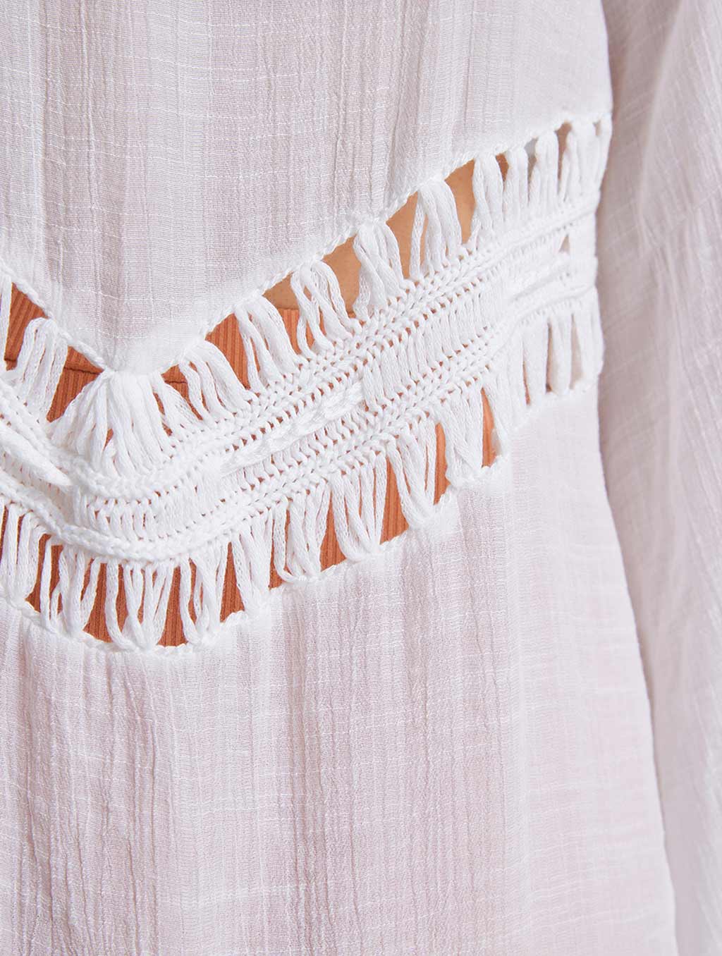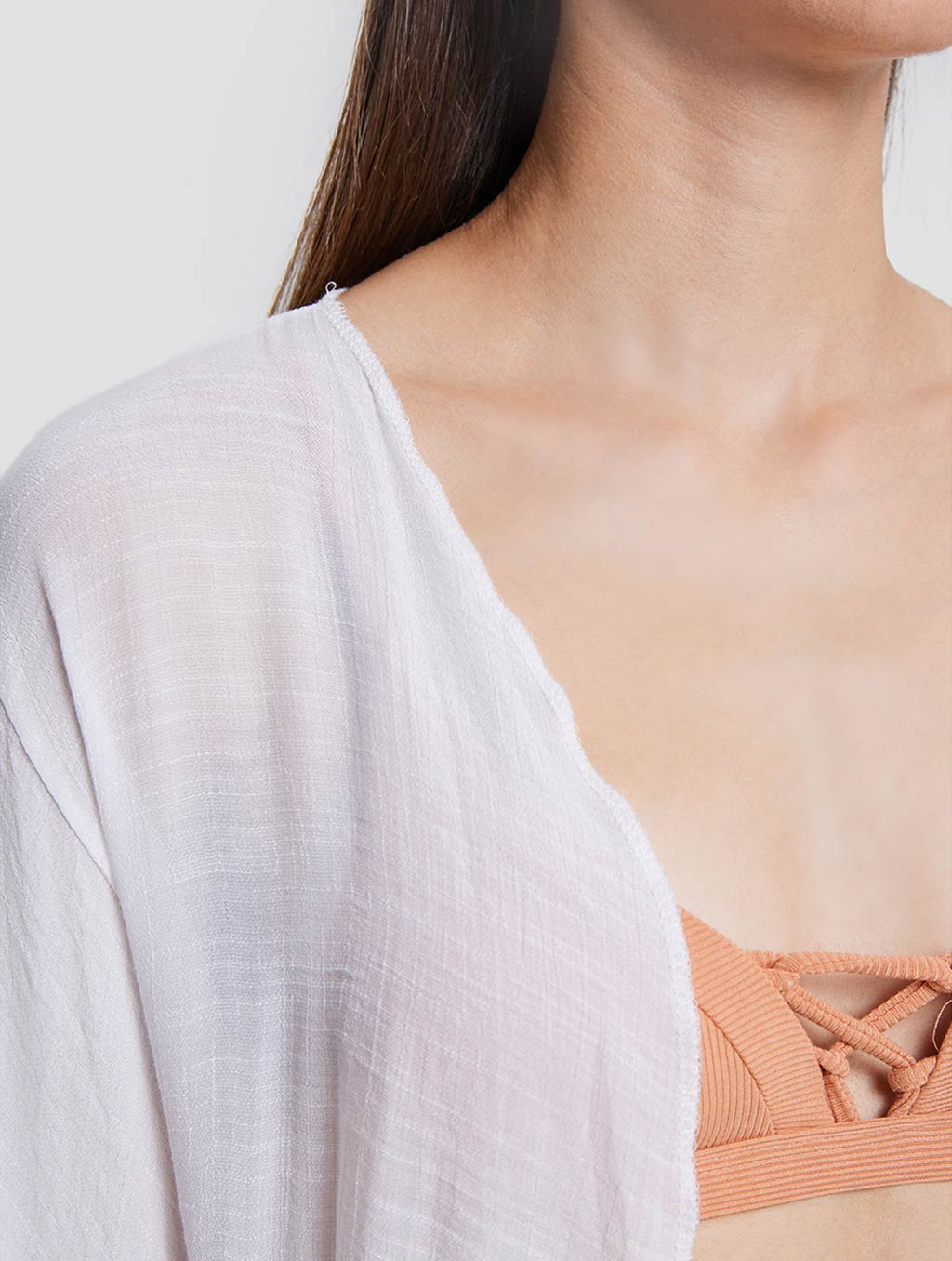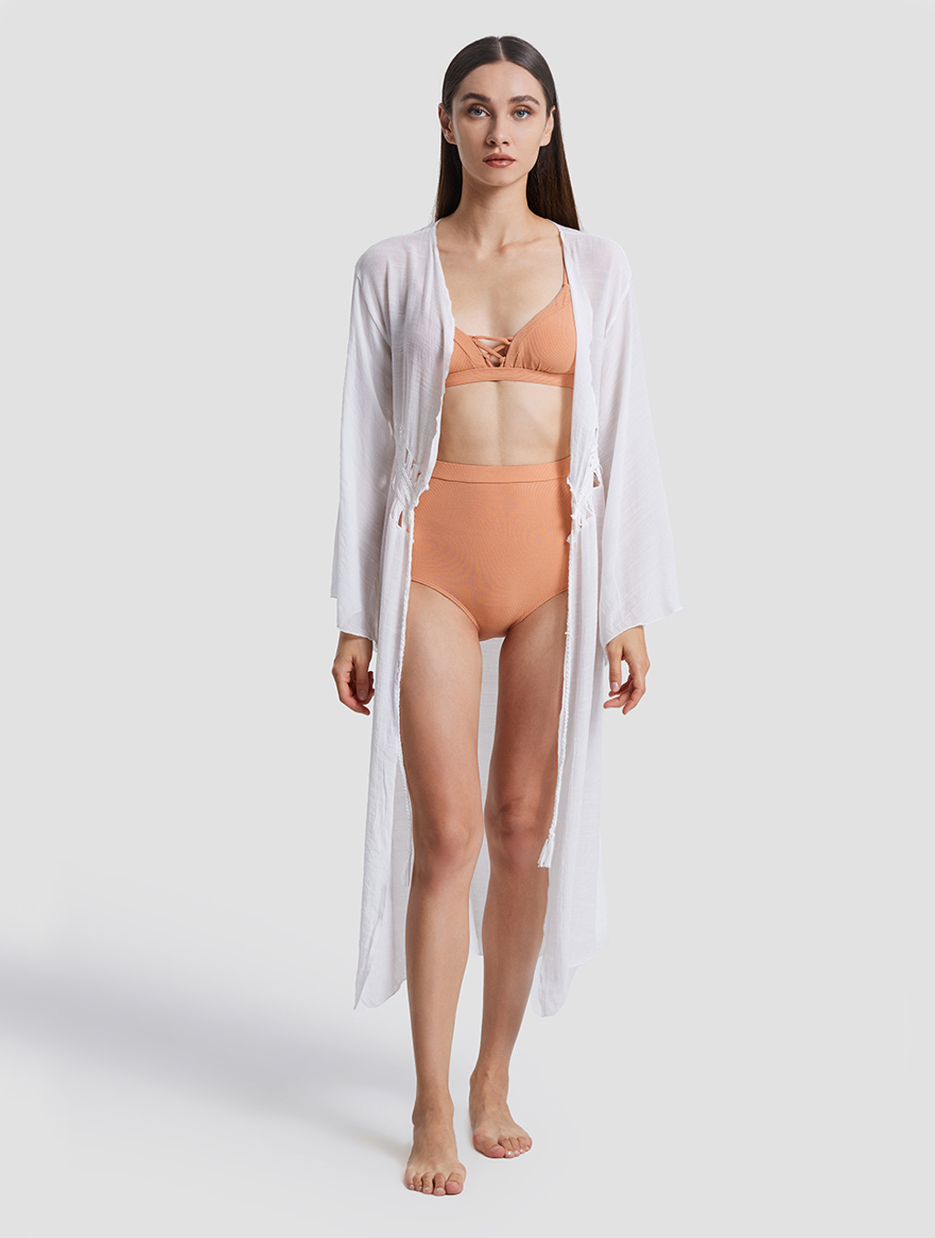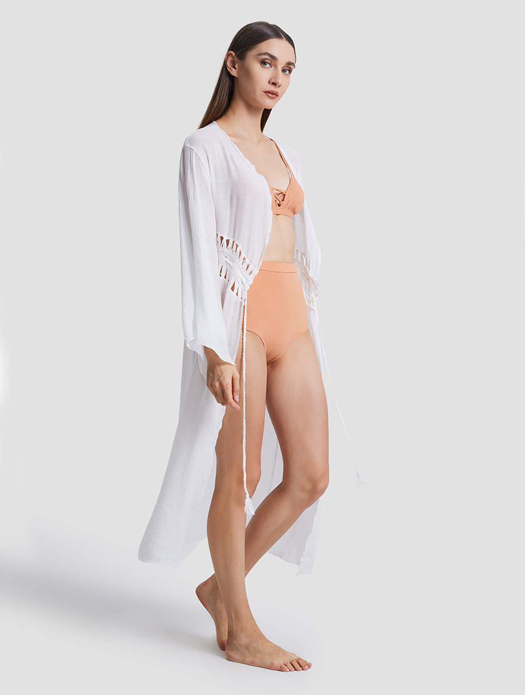 A semi-transparent solid-color cardigan jacket with a rope, which can be used as sun protection clothing.