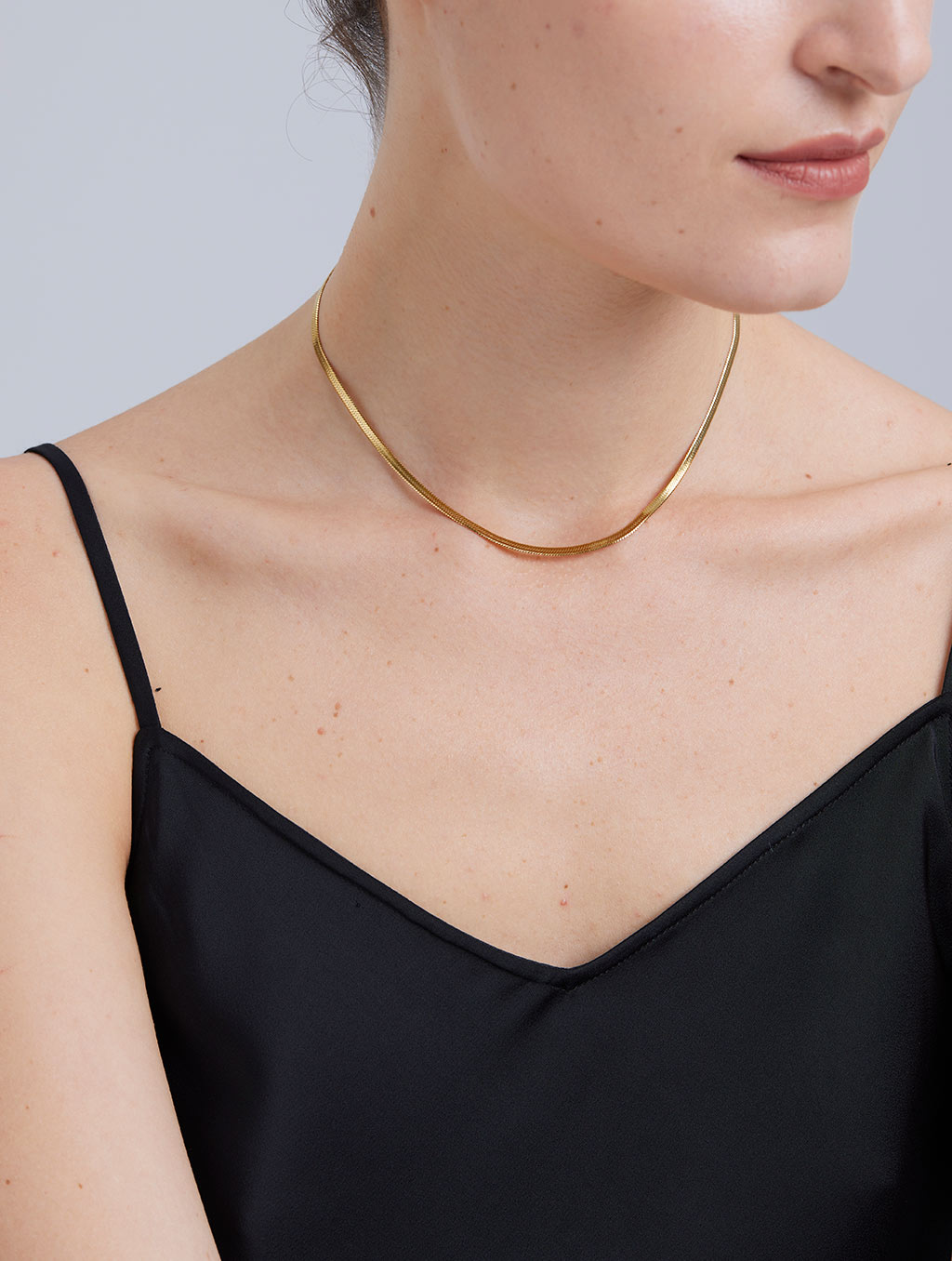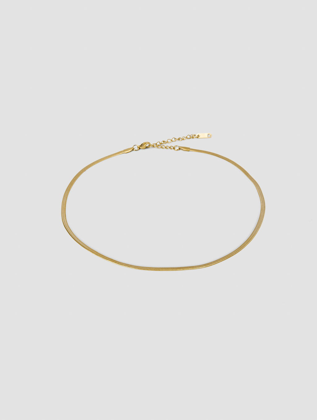 18k gold plated brass. A classic snake-bone bracelet to add a feminine zest to any style. It can be matched with casual and formal attire, and the flowing lines bring out an extremely shiny and reflective texture.