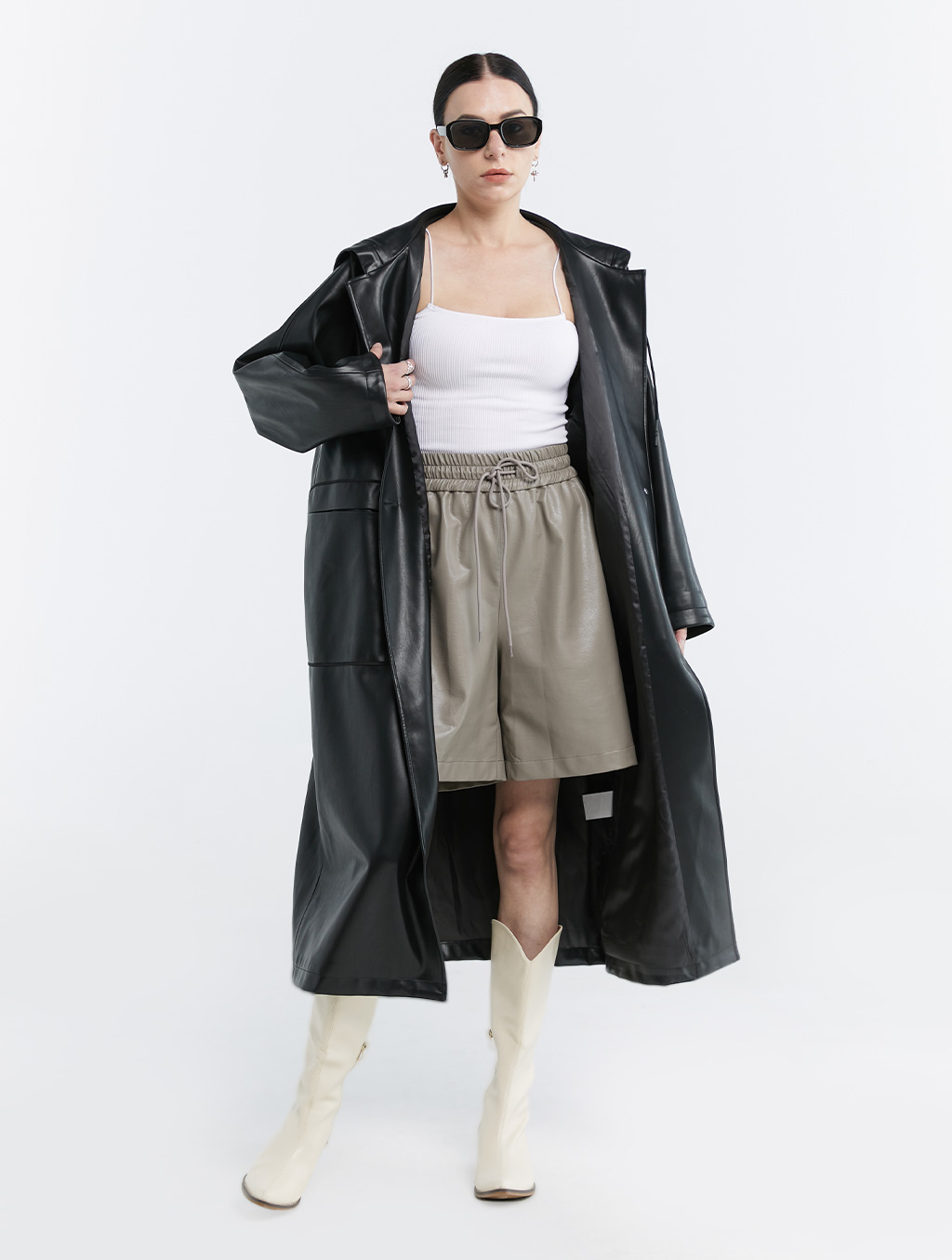 Hooded Faux Leather Coat Black L